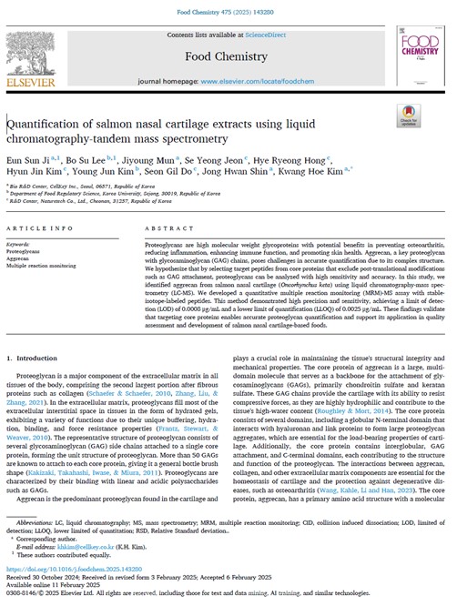 셀키에이아이는 건강기능식품 및 화장품 전문 제조기업 네이처텍과 공동연구를 통해, 연어코연골에서 프로테오글리칸 특이 펩타이드(AEPTIIHTETR)를 세계 최초로 규명하고 분석법을 확립했습니다. 이는 생체 유래 복합 단백질 구조 속에서 기능성을 지닌 핵심 펩타이드를 과학적으로 밝혀낸 연구로, 식품 기반 기능성소재 연구의 새로운 가능성을 제시했습니다.